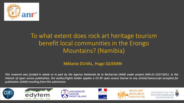 Mélanie Duval & Hugo Quemin, "To what extent does rock art heritage tourism benefit local communities in the Erongo Mountains?", The COSMO-ART Conference on Rock Art, Kimberley, South Africa, 30 Nov. - 6 Dec. 2025.