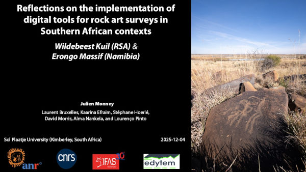 Julien Monney, Laurent Bruxelles, Kaarina Efraim, Stéphane Hœrlé, David Morris, Alma Nankela & Lourenço Pinto, "Reflections on the implementation of digital tools for rock art surveys in Southern African contexts: Wildebeest Kuil (RSA) and Erongo Massif (Namibia)", The COSMO-ART Conference on Rock Art, Kimberley, South Africa, 30 Nov. - 6 Dec. 2025.